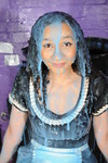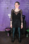 Cindy wears genuine green American Apparel disco pants, leather shoes, a black halter-neck swimsuit, with a see-through short mesh dress over the top.