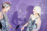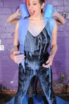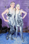 Two lovely girls, in very hot skin-tight outfits, totally drenched in blue goo!