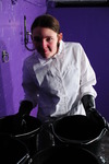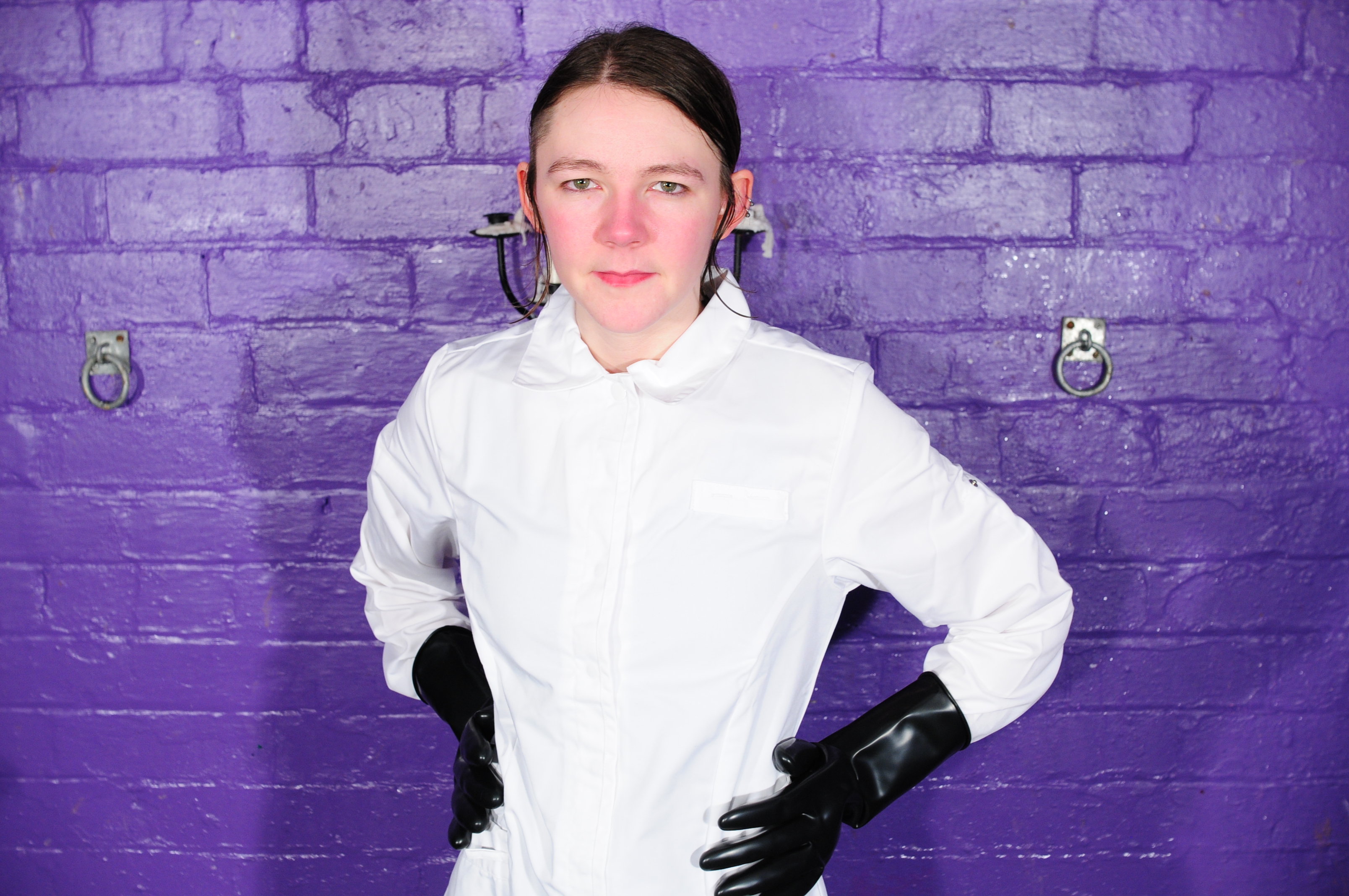 Doctor Chastity, wearing her white lab coat and huge black rubber gauntlets, demonstrates a new method of defending the estate from intruders using water triffids. No-one is entirely sure what these are or do, but Doctor Chastity gets totally drenched in the process!