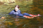 Chastity goes for a paddle and wallow in the river wearing a vintage 1970s blue denim jumpsuit and union jack wellington boots. She gets completely soaked from head to toe and spends a good long while playing in the river soaking wet.