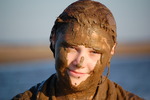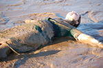 Wendy, wearing one of her uniform dresses over an already wet swimsuit from a previous dip in the water, first plays in the shallows with Evelyne, they sit in the water and splash each other, and then throw liquid mud at each other, with Wendy enthusiactically covering herself completely in the sandy mud, inclduing her hair.