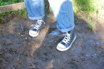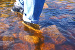Purity, dressed in leotard, denum dungarees, and Converse style boots, wades waist deep into a pool in the river, ducks down, swims, and then releaxes, soaking wet, in the shallows.