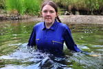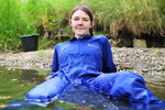 Wearing a blue boilersuit and wellies into the cold river