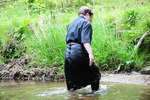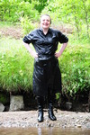 Note the skirt Evelyne is wearing is real leather, not pleather or vinyl, as are her boots. She is wearing black tights under the skirt but we hardly get to see them, though of course they get totally drenched under the skirt. Evelyne realy enjoys splashing about in rivers and the sea, and chose this outfit herself to get soaked in.