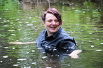 She wades in and out several times, sometimes letting the skirt inflate, another time releasing the air at the waistband so the skirt sinks into the river with her. She fully submerges, and comes leaping back to the surface in a great splash of water.