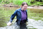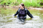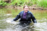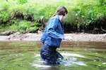 She soaks her lovely long denim skirt first, wading carefully into the water and soaking the skirt all the way to her waist before turning and wading out again. Back in she goes, and this time she doesn't stop till her t-shirt and denim jacket are completely drenched too, and then she goes for a bit of a swim in the water, proving that wellies and a skirt are no impediment to swimming.