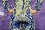 Custard follow the Devon Dream, lots and lots of it, first poured inside and then poured and carefully spread all over her clothes, including a tray-sit and plenty of wiggling. She covers her suit completely, front and back, and leaves not a single stich clean, including thorough coverage below and between her legs.