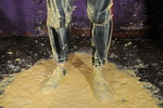 Fidelity is strapped into our heavy leather bondage harness, which is then chained to the ceiling hook. Fidelity is still standing on her feet but cannot move more than a foot or two in any direction - which means that she's just going to have to accept whatever Mistress Chastity, looking stunning in a vinyl catsuit with lace-up back detail, choses to do to her. Needless to say, a very thorough gunging ensues!