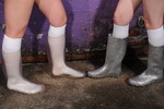Once their boots are nicely squelchy and their white socks reduced to mess-drenched ruin, they start on each other's shorts, mixed messes poured in front and back so they are both sitting in pools of soggy mess inside their shorts. Then their t-shirts get the treatment, and finally their heads and hair too.