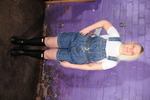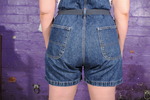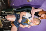 Miss Abigail wears forest green American Apparel disco pants and a black sporty crop-top, and shiny green Hunter wellies. Fidelity wears blue denim shortalls over a white t-shirt, bare legs, and shiny black Hunter wellies. Before the messing starts, they agree that Fidelity's outfit could do with improvement, so Miss Abigail takes a pair of scissors and sets about Fidelity's t-shirt, slicing off the bottom third to make it a crop-top, and then cutting a 'V' neck into it too. After which Fidelity does her dungarees back up over it, and the mess commences!