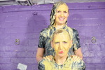 Susie and Honeysuckle, almost identically dressed in black jodhpurs, tucked-in polo shirts, and Hunter wellies, test each others' outfits with lashings of custard. The fill each others' jodhpurs, then spread custard all over the outside, and once the trousers are totally coated they set about each others' polo shirts, and then finally their heads and hair get the treatment too. Both women end up completely covered in custard.