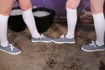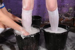Having drenched each other's shorts in slime next they tackle each other's feet - Maude has her shoes taken off, filled with gunge, and then slips her feet in their clean dry socks back into the goo-filled shoes, while Honeysuckle ends up standing in two buckets of gunge, while Maude carefully spreads the slime up her socks and onto her bare legs.