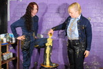 Fidelity wears jeans, blue shirt, and denim jacket, while Honeysuckle wears a gorgeous blue denim jumpsuit, and both wear wellies, all the better to catch the messes that will soon be slithering down inside their jeans and jumpsuit legs.