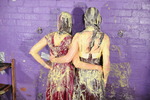 Both girls receive a total custard shampooing from clean at each other's hands, their dresses suffering as drips and dollops of custard drop down from their messy hair. Once each girls's hair has been totally covered and the custard deeply shampooed in, they then set about each other's dresses properly, until both are totally drenched in custard from head to toes. There is barefoot action including messy soles presented to the camera for a detailed view.