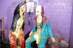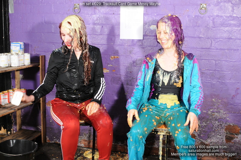 They've deliberately dressed for their impending messing, in sportswear that will really show the effects as the gloop is poured on and in, but still look good clean, and great messy! Lady Jennifer wears an entirely matching full tracksuit in turquoise with pink details and a purple hood, which exactly matches her purple hair. She wears black and white trainers. Honeysuckle wears red tracksuit trousers with a black tracksuit jacket, and black converse-style basketball boots. They both wear swimsuits under their tracksuits, and know they'll be having those filled, soon enough!