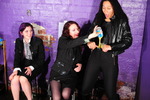 Joining her is the ever-lovely Friday, in tight black smart trousers, a black silky top, black leather-look jacket, and calf-high black leather boots, and Maude as the dealer, in a plain black pencil skirt over bare legs, a grey and white shirt, black busines jacket with red silky lining, and black ankle boots.