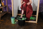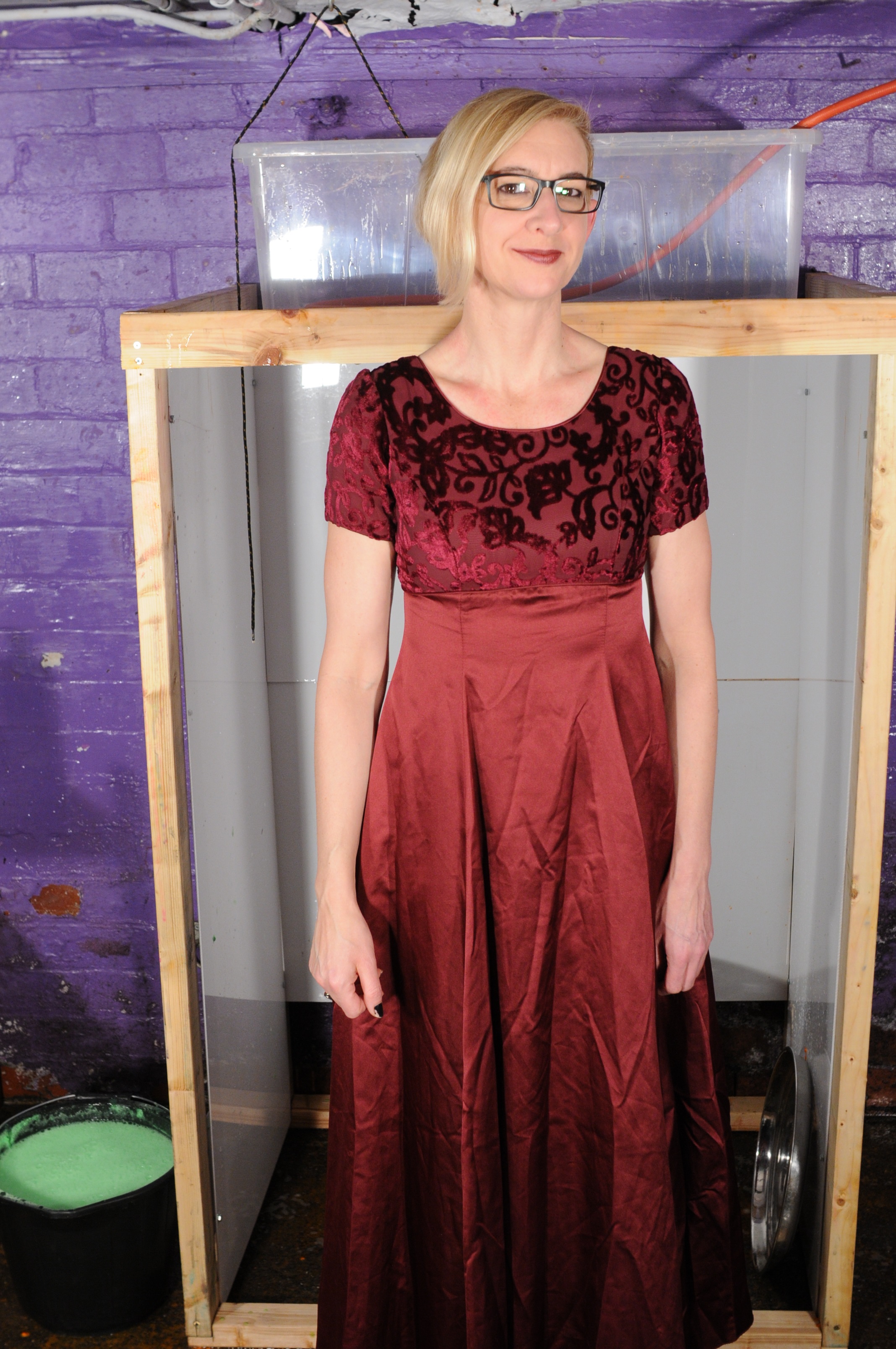 She plays in the gunge, utilising the spare bucket she previously put her feet in to ensure every last inch of her dress is covered and soaked, including pouring gunge down inside it. Meanwhile the tank is refilling with water, and once it's full, she pulls the cord once more and lets 70 litres of water cascade all over her gunge-soaked self.
