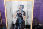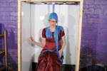 First she fills the tank with blue and green gunge, bending and stretching in her lovely dress while we watch her work. But she doesn't immediately give herself the deluge, instead, first she fills a tray with green gunge, places it on the tank seat, and sits in it, standing up again afterwards to show off the mess it's made of the seat of her dress. You can see her reacting as she lowers herself into it and the gloopy wetness soaks through the satin of the dress too. Then she sits again, still in the tray, and plunges her heel-clad feet into a spare bucket of gunge, totally drenching her shoes in green goo. And then she sits back and pulls the cord, unleashing a tide of blue and green gunge on herself from above, drenching her dress in gloop and turning her head into an unrecognisable ball of goo.