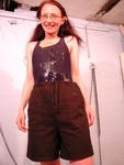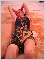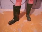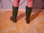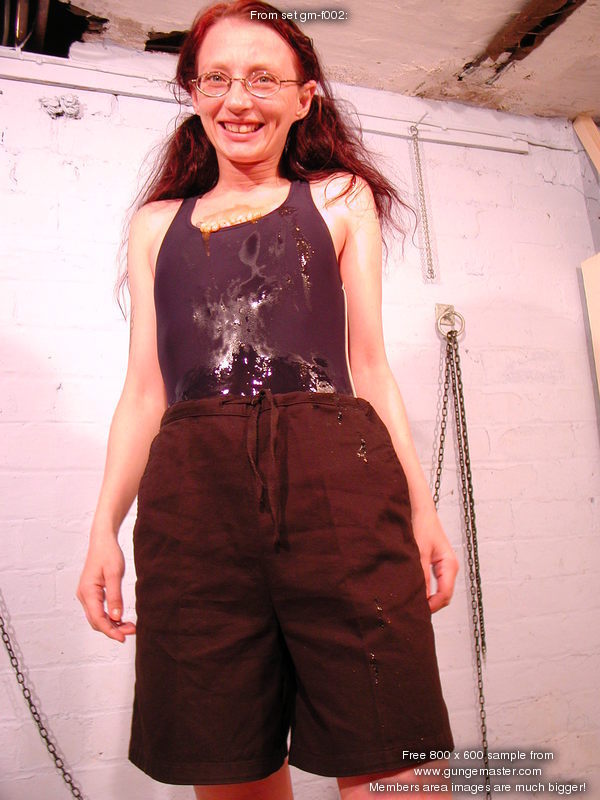 Sometimes Lady Jasmine just likes to pull on something scruffy and drench herself in whatever gunge happens to be handy. On this occasion, freshly changed and washed from one of her slow, carefull garment-testing sessions, and with the custard from that session still puddled on the dungeon floor, she spends a relaxed hour pouring a mixture of baked beans and chopped spagetthi into her swimsuit, shorts, and green wellington boots, enjoying the feeling of the gunge flowing down and collecting inside her swimsuit, soaking through her shorts from the inside, and sliding down her legs to collect in her boots.