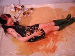 After a while she sits down in the puddle of mixed mess and plays with her well-filled boots, then stands again and pours a can of beans into the back of her shorts, before sitting once more in a yoga position and covering her head and hair. Finally, she lies down in the pool of mess, scoops handfuls up to add to her saturated swimsuit, and finishes by posing for the camera in her totally drenched outfit.