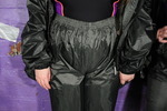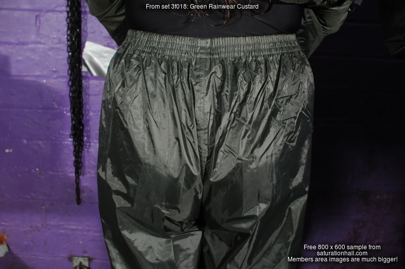 Cinthia has invited her friend Elsie to join her for a weekend at the Hall, and while she's here she decides to join in on a rainwear custard test. Both ladies are identically dressed in black swimsuits with orange and purple detailing, over which they wear brand new olive green rainsuits, plus wellies. Before they can begin the tests, the rules state that they much have some custard poured inside the front and back of their swimsuits, just to make sure they have fully embraced the spirit of the testing, which is designed to get mess inside the suits.