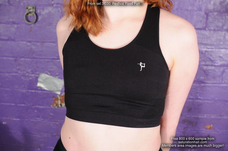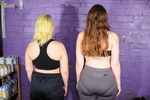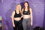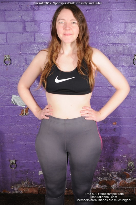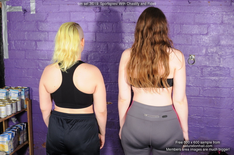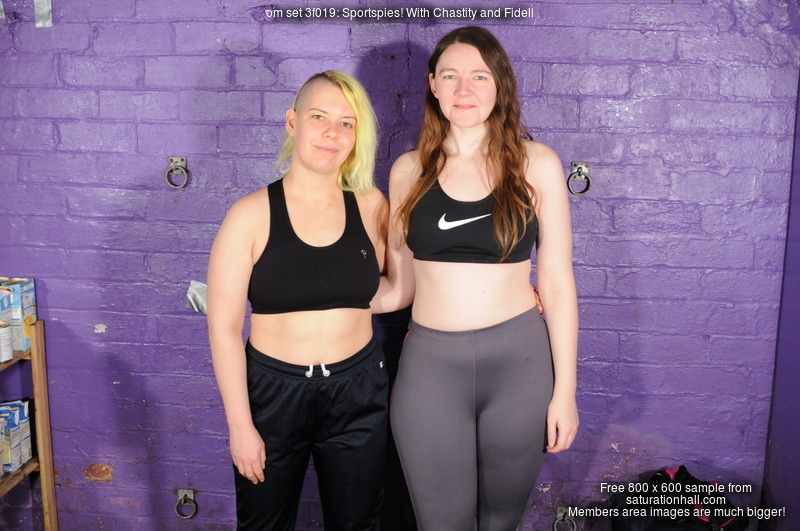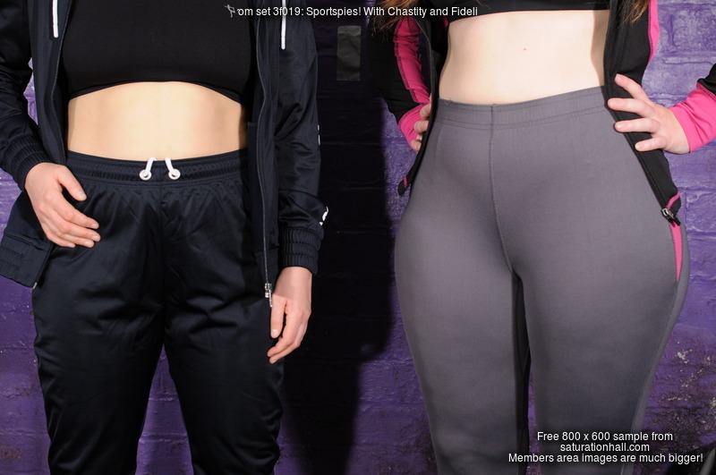Chastity has returned to Saturation Hall, and brought her friend and colleague Fidelity with her. And is now going to demonstrate one of our traditional custard-assisted workout routines. Both girls are dressed in sportswear, a navy blue Champion tracksuit for Fidelity, while Chastity wears skin tight grey running pants and light jacket, in both cases over sports bra crop tops.