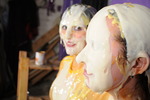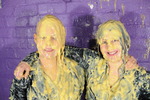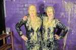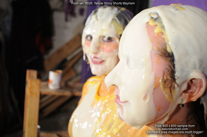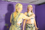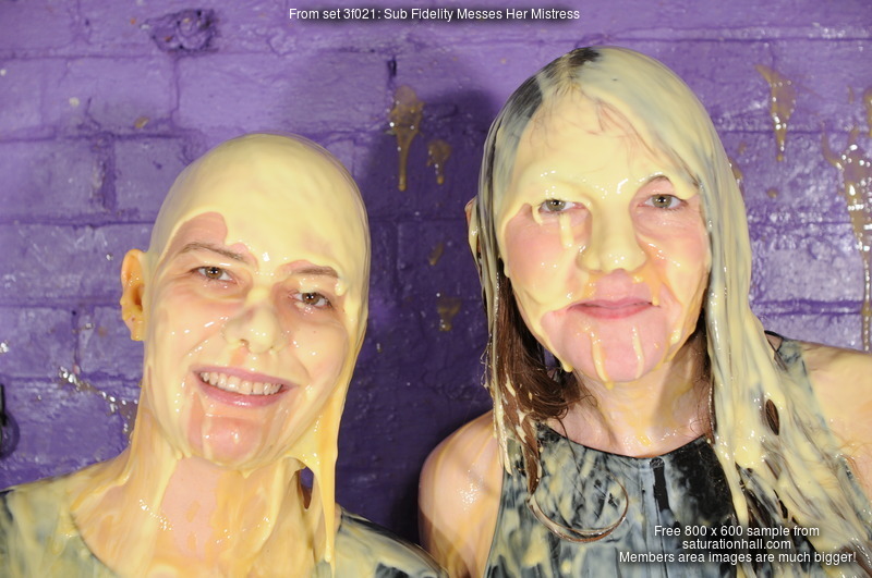 A playful scene in which both girls happily submit to each other and are gradually reduced to wet and slippery messes at each other's hands. There's lots of laughter, custard and cream thrown and poured over each other, dressed drenched in slop, some happy pieing each other in the face with amused laughter at the results, and oif course our trademark full messy hair shampooing.