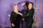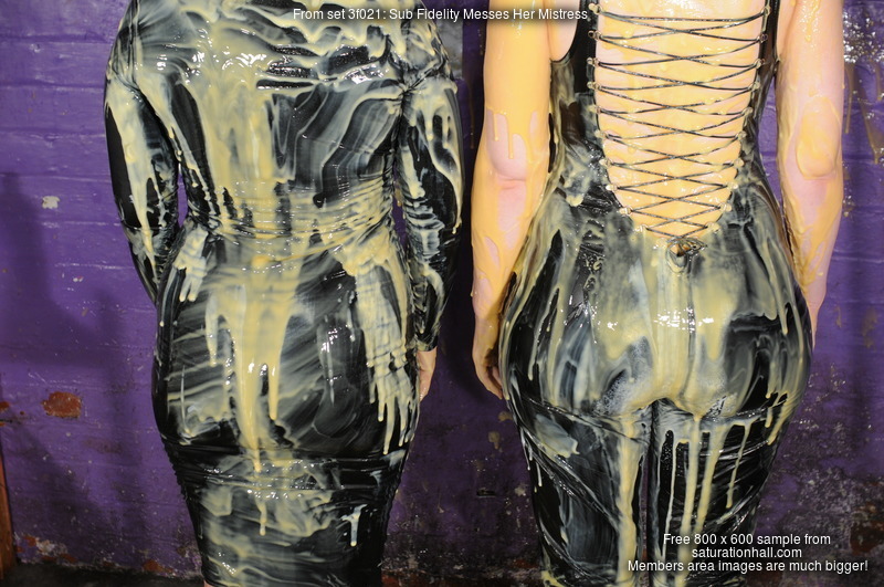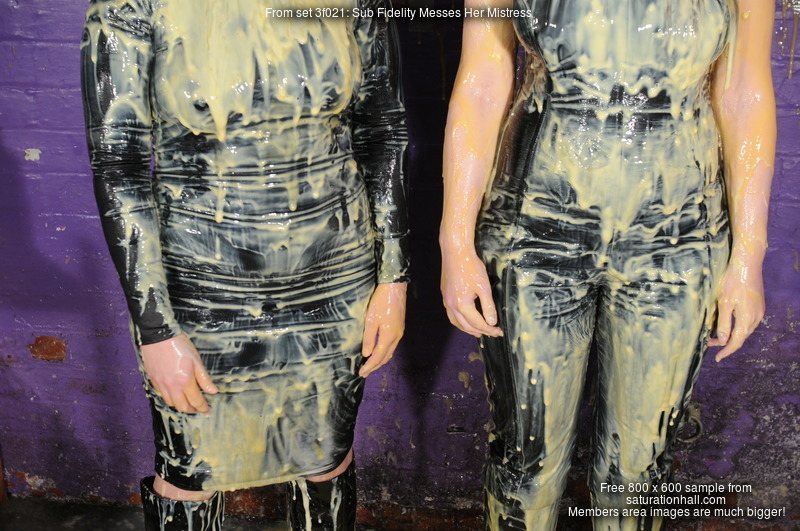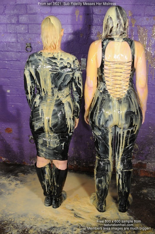Though in a generous spirit, Fidelity, who's changed into a very nice skin tight spandex bodycon dress, and clean boots, is going to allow Chastity to give as good as she gets, so Fidelity is in for another drenching in goo, too.