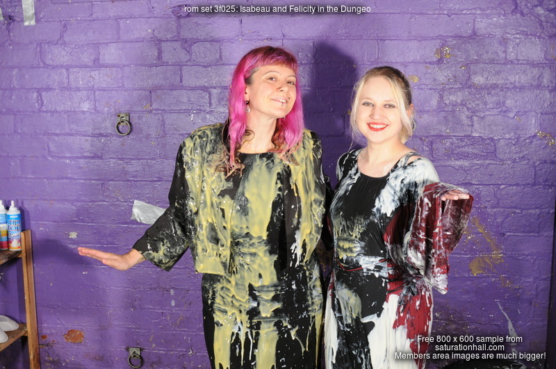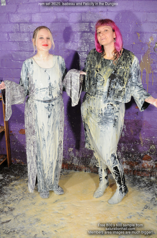 Of course, no-one ever leaves these halls ungunged, so you can imagine what happened when Isabeau, smartly dressed in a black office dress, black leather boots, and a nice short smart jacket, happened to wander into the dungeon, a room that she somehow found strangely familiar, while Felicity, in her favourite medieval uniform dress, just happened to have a plentiful supply of custard and cream to hand.