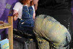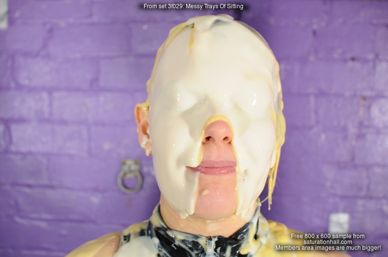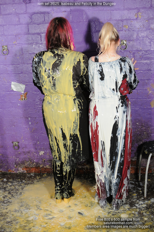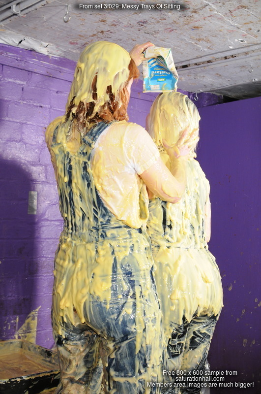 They start with clothes filling, cream and custard poured into each other's outfits, Miss Abigail's disco pants showing leak-through from the first pour, while Fidelity's denim outfit resists show-through at first. though leaking mess is soon dripping down her legs. They add more and more mess, and before long both girls are almost unrecognisable under all the gloop filling and covering their clothes. Boots are taken off, filled with slop, and put back on, trays and cakes are sat in, and they pour mess over each other's heads too.