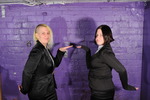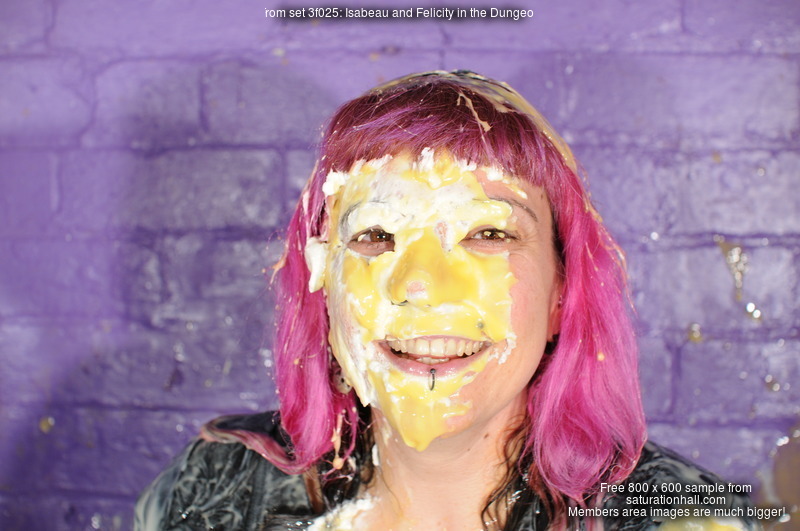 Regular viewers may remember that back in scene gm-3f020, Mistress Chastity, in a rather fetching lace-up-back PVC catsuit, chained her sub Fidelity up in the middle of the dungeon and mercilessly messed her up. Well of course in this house there are rules of fairness, and no-one wants to tempt the fates too much. So now, Mistress Chastity, still dressed in her clean PVC from the previous scene, is going to get rarther messy herself, as Fidelity decides to teach her all about custard pies.