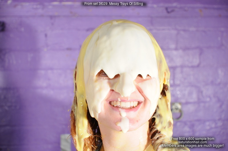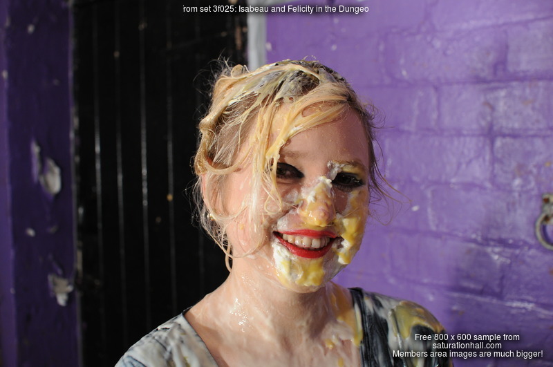 By the end of the scene, both girls are totally drenched in slippery, soggy wetness, covered and soaked in custard and cream. Fidelity even has the hood of her jacket filled and then plonked onto her head. Total hair coverage too, and their faces well coated from the pies.