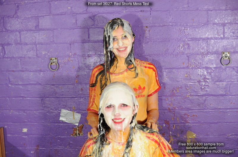 Both girls end up utterly drenched in mixed mess from head to toe, shorts engulfed, shirts soaked, shoes and socks totally messed, and their hair reduced to custard-soaked ruin.
