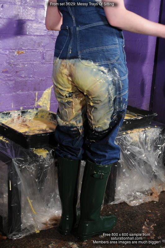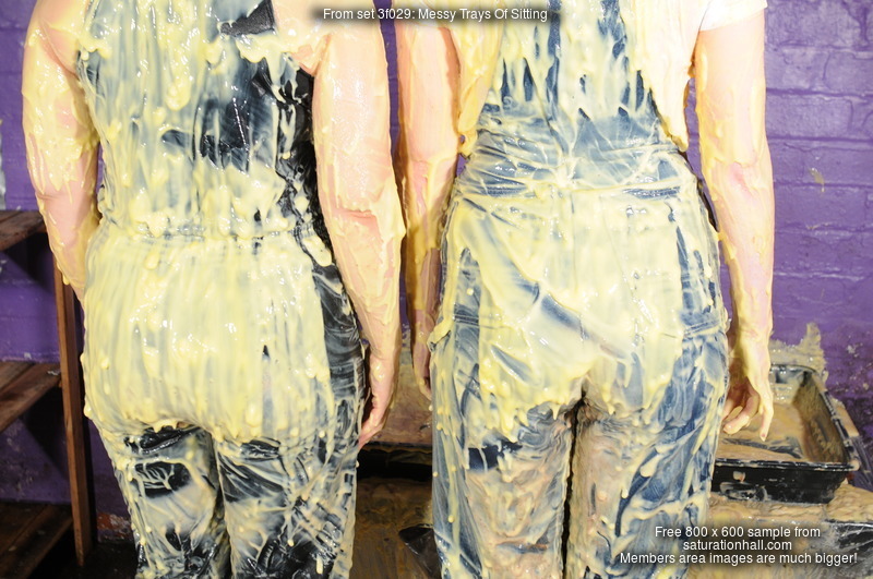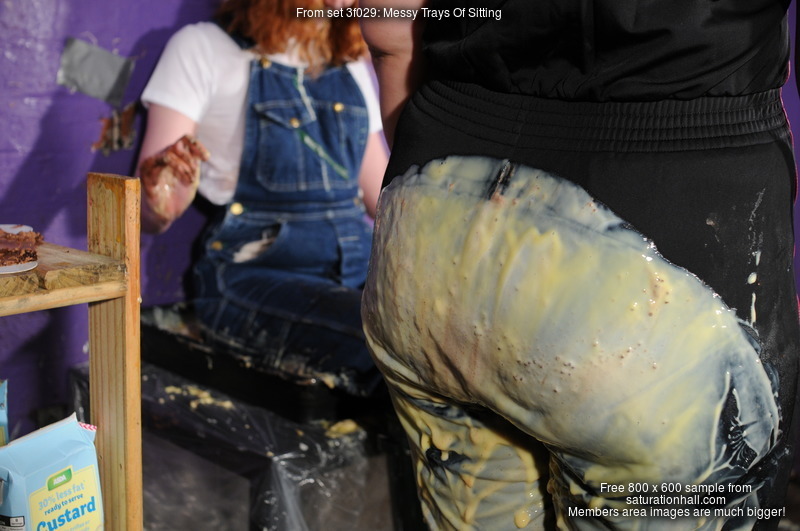 This continues for some time while the trays get steadily fuller and both girl's bottoms, and then the backs of their legs, are reduced to messy ruin. Eventually Miss Abigail's tray overflows, which is the cue for Fidelity to pick up her own very full tray and pour its entire contents all over the still clean front of Miss Abigail's dungarees. Needless to say Miss Abigail then returns the favour and empties her own tray all down Fidelity's nice sports suit.