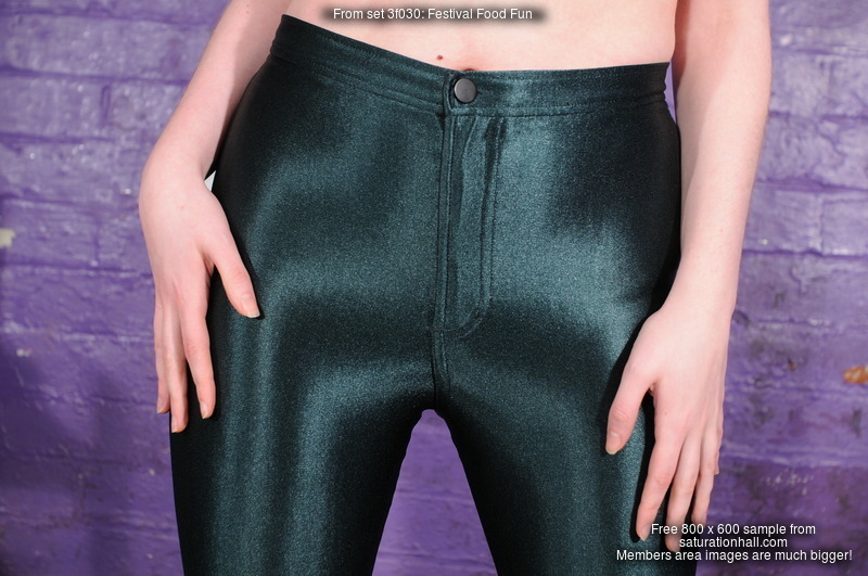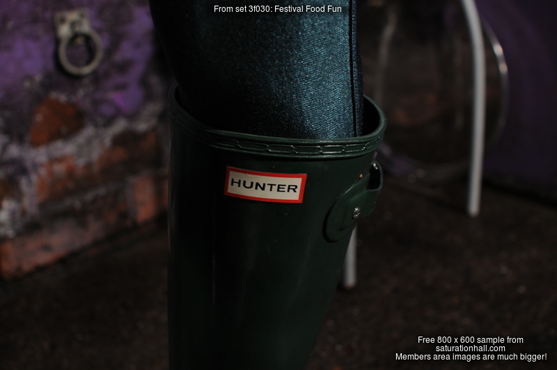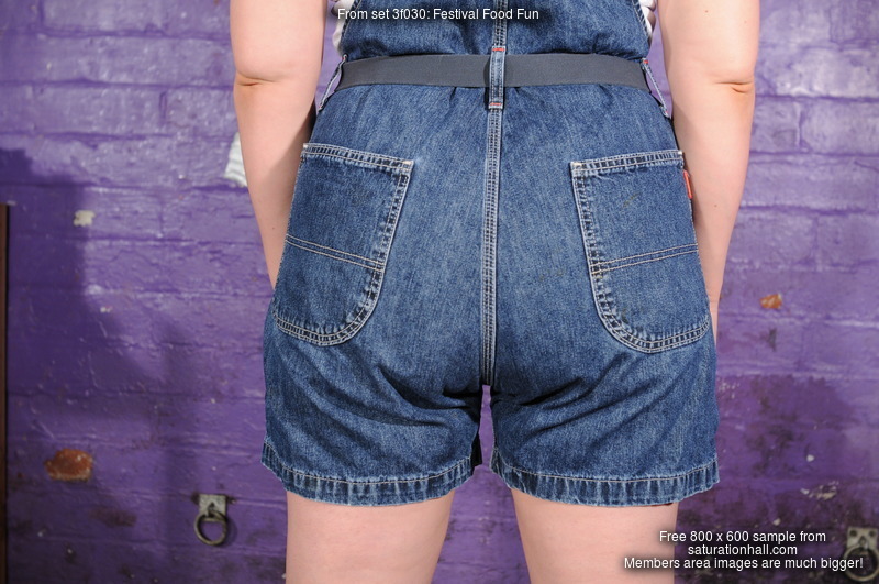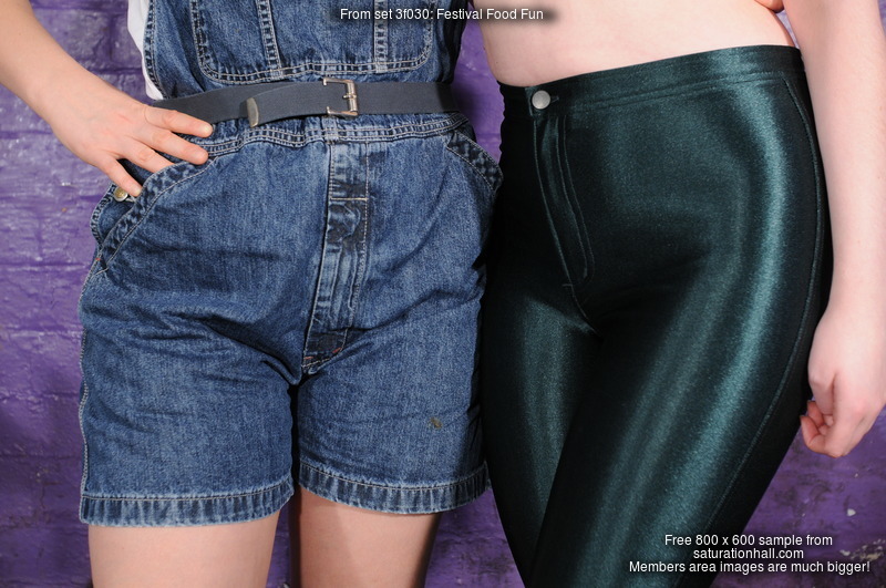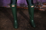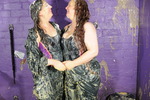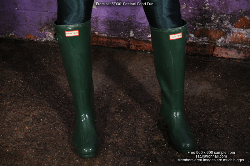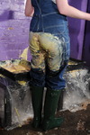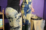 Miss Abigail wears forest green American Apparel disco pants and a black sporty crop-top, and shiny green Hunter wellies. Fidelity wears blue denim shortalls over a white t-shirt, bare legs, and shiny black Hunter wellies. Before the messing starts, they agree that Fidelity's outfit could do with improvement, so Miss Abigail takes a pair of scissors and sets about Fidelity's t-shirt, slicing off the bottom third to make it a crop-top, and then cutting a 'V' neck into it too. After which Fidelity does her dungarees back up over it, and the mess commences!
