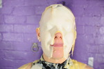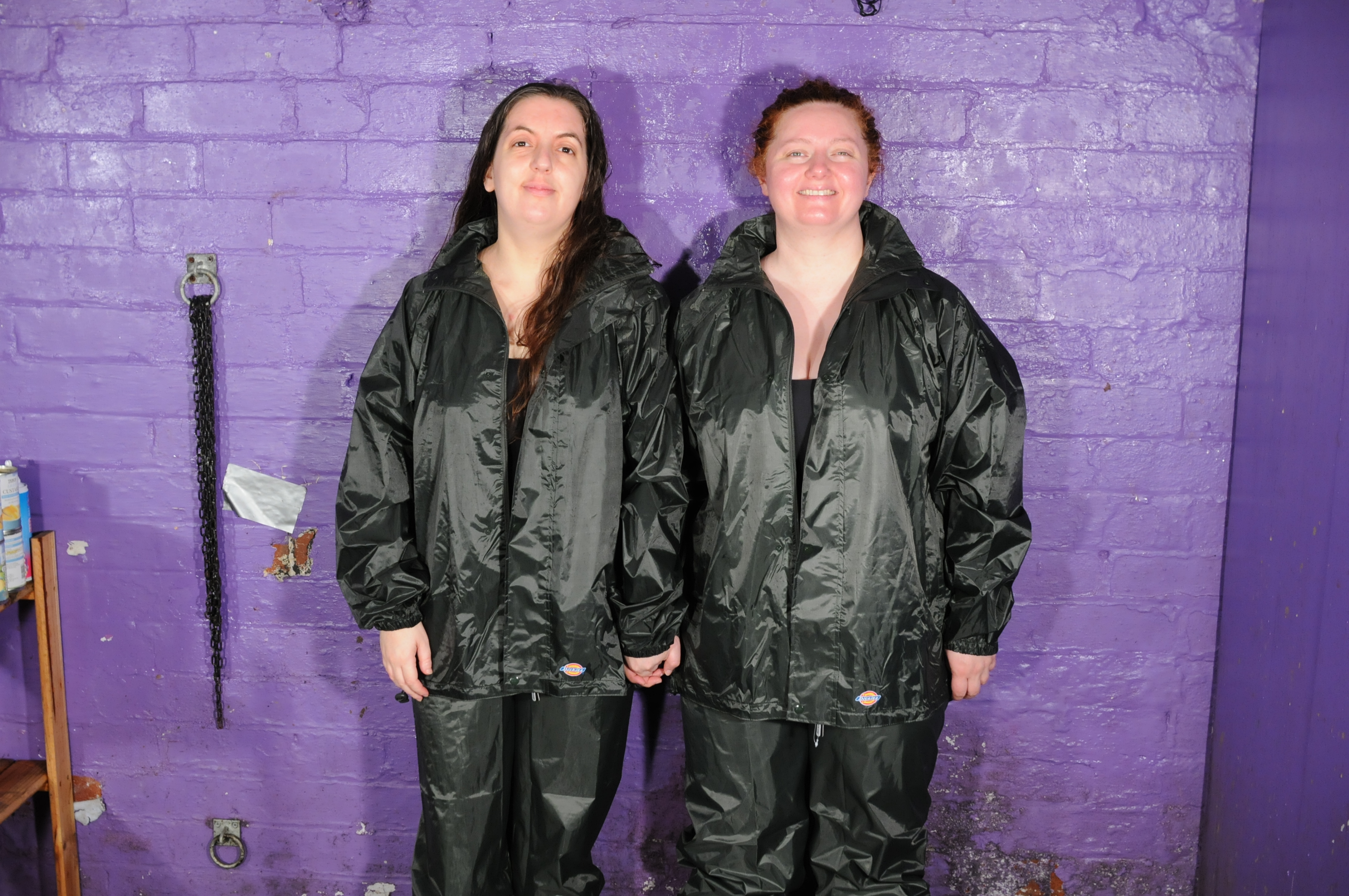 Taking turns, Elsie first, they both get totally drenched in custard. First they throw it over each other with the rainwear all done up, keeping them dry inside. But all too soon it's time for the internal tests, and so custard poured inside their trousers is the order of the day, not to mention hoods being filled and the placed on clean heads, covering their hair.