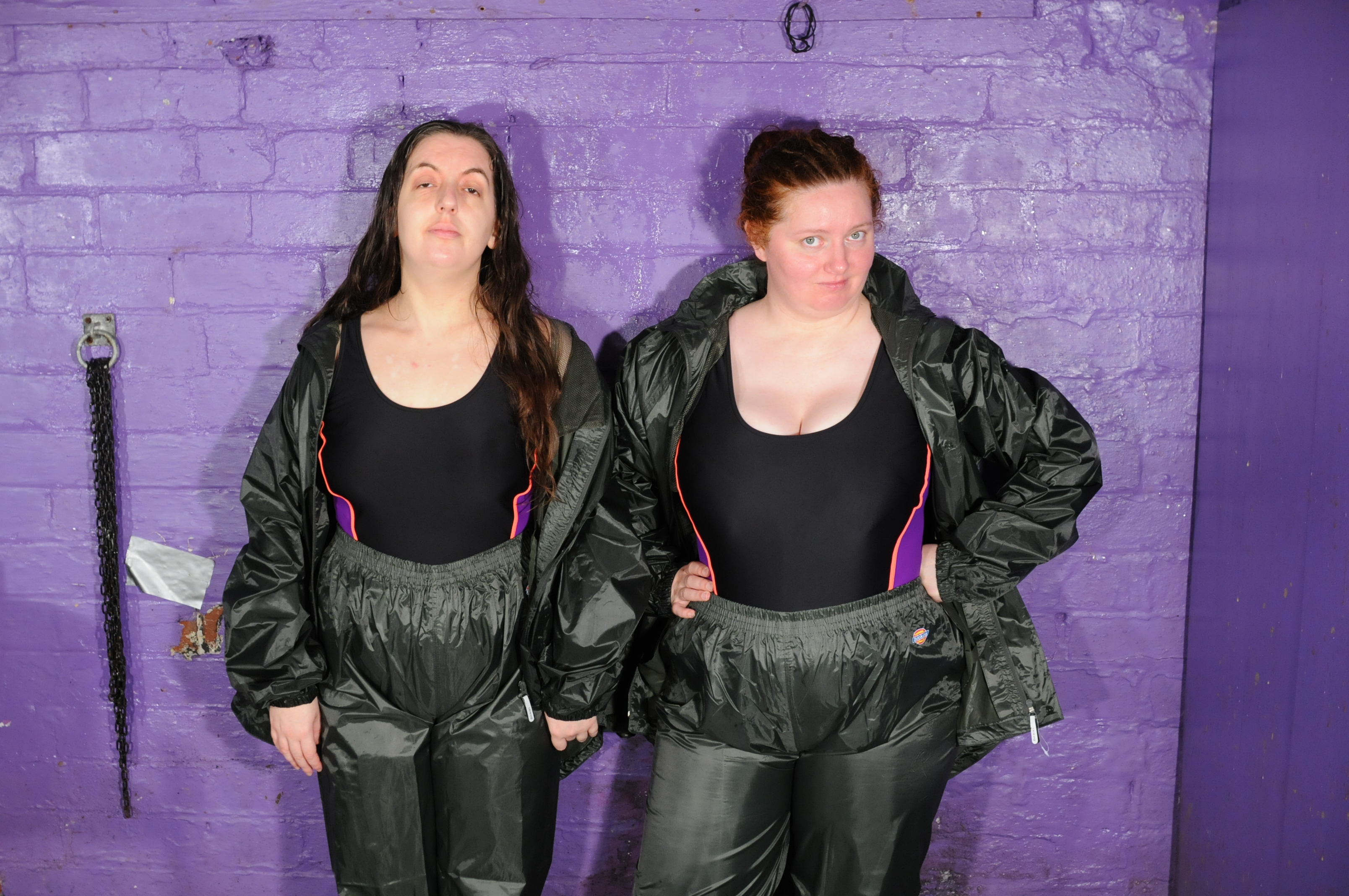 They start some exercises, and then Chastity starts to pour custard and cream down inside the front of Fidelity's tracksuit trousers. Of course fair is fair and soon Chastity is having sweet yellow mess poured down inside her running pants, they grey soon showing the stains beautifully as the wet gloopiness flows down inside.