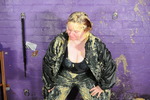 Fidelity is strapped into our heavy leather bondage harness, which is then chained to the ceiling hook. Fidelity is still standing on her feet but cannot move more than a foot or two in any direction - which means that she's just going to have to accept whatever Mistress Chastity, looking stunning in a vinyl catsuit with lace-up back detail, choses to do to her. Needless to say, a very thorough gunging ensues!