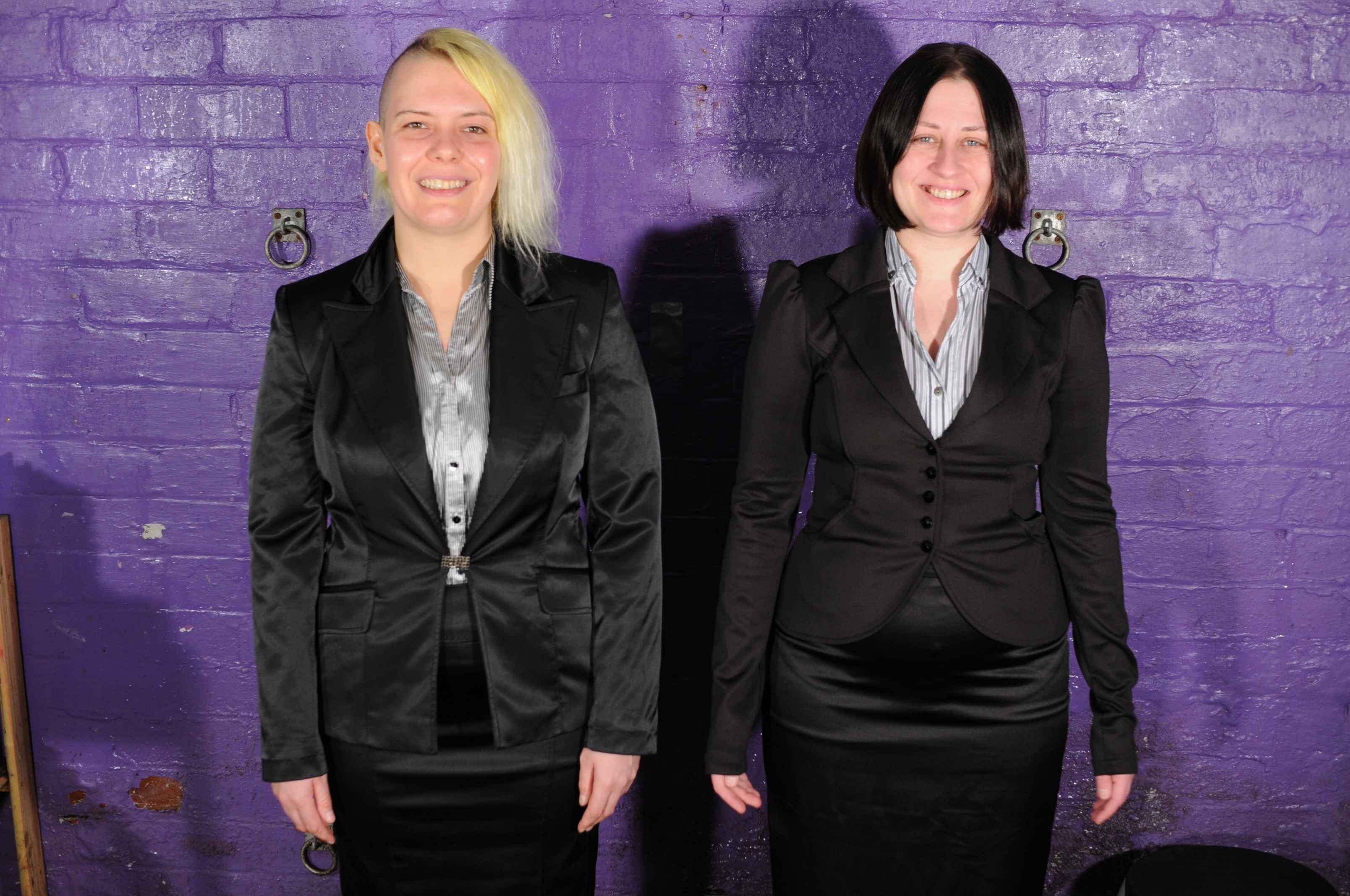 Cream down their cleaveages is the first order of business, two pots of Dream each neatly poured in between their breasts and down inside their smart blouses. From outside their outfits still look pristine, but we know, and they can feel, the creamy liquid spreading and soaking its way through their clothes as they walk around the dungeon. Their third pot of Dream each goes down the backs of their necks, inside their shirts, with suitable squeals and reactions as the cold liquid flows down.