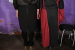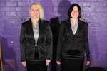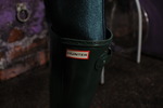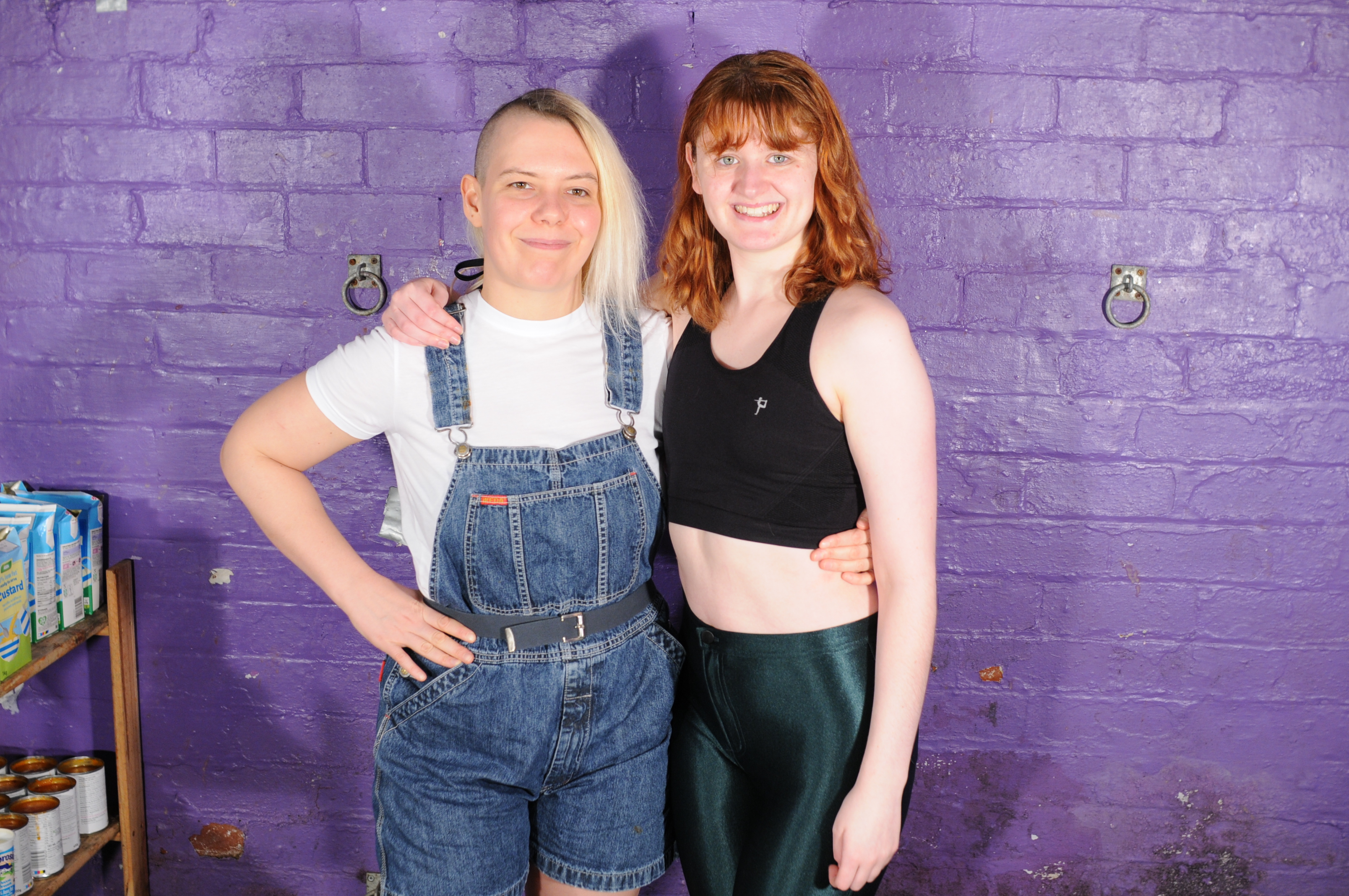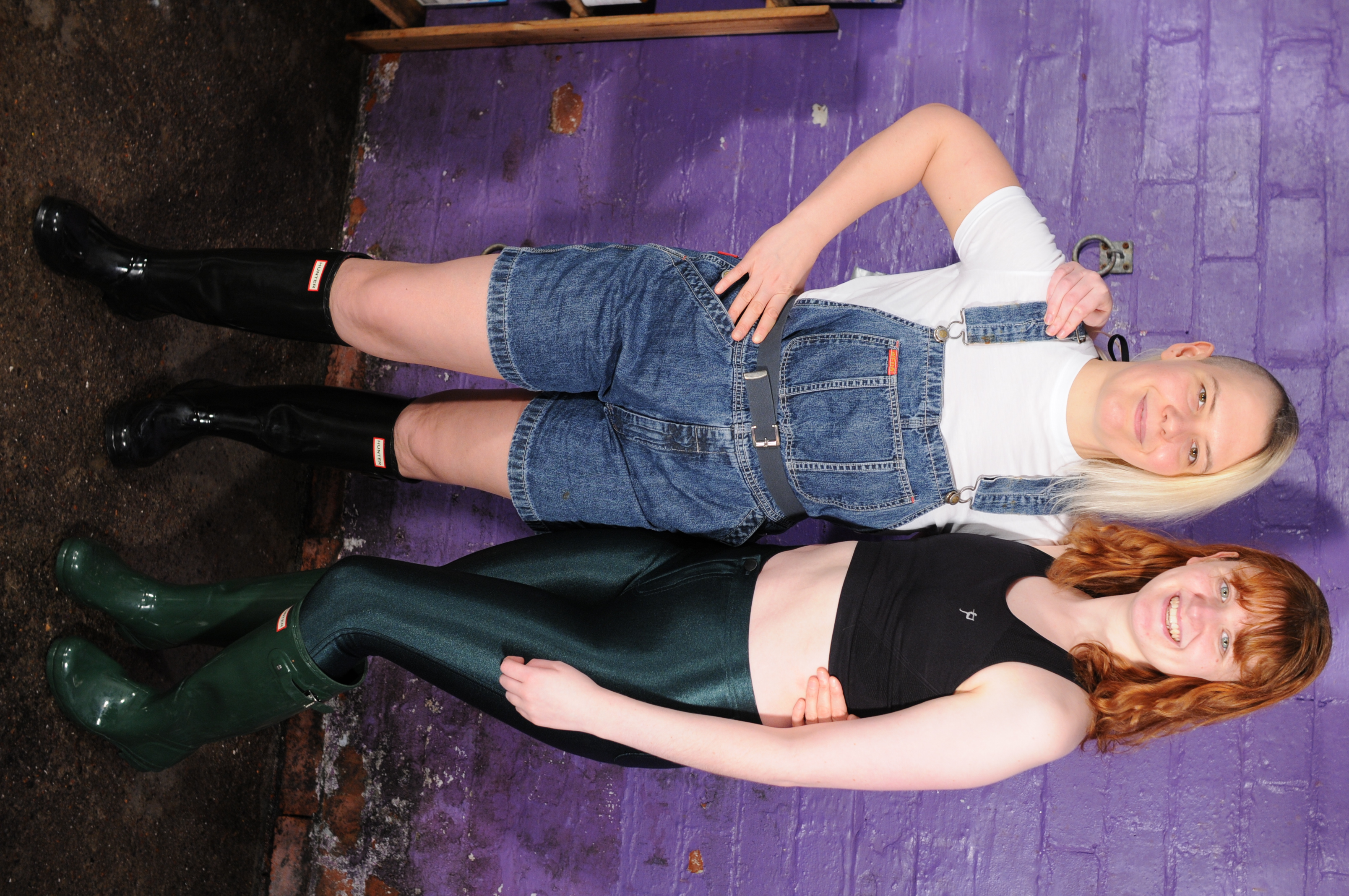 Miss Abigail wears tight fitting denim dungarees over a white t-shirt, with green Hunter wellies, while Fidelity wears a black sleeveless Nike sports jumpsuit over black sports bra and pants, with black Hunter wellies.