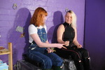 Miss Abigail now sits in the other, still clean tray, while Fidelity stands, letting us see the now messy bum of her outfit, takes a pot of cream, and pours it inside Miss Abigail's t-shirt, to create some nice sogginess for her too.