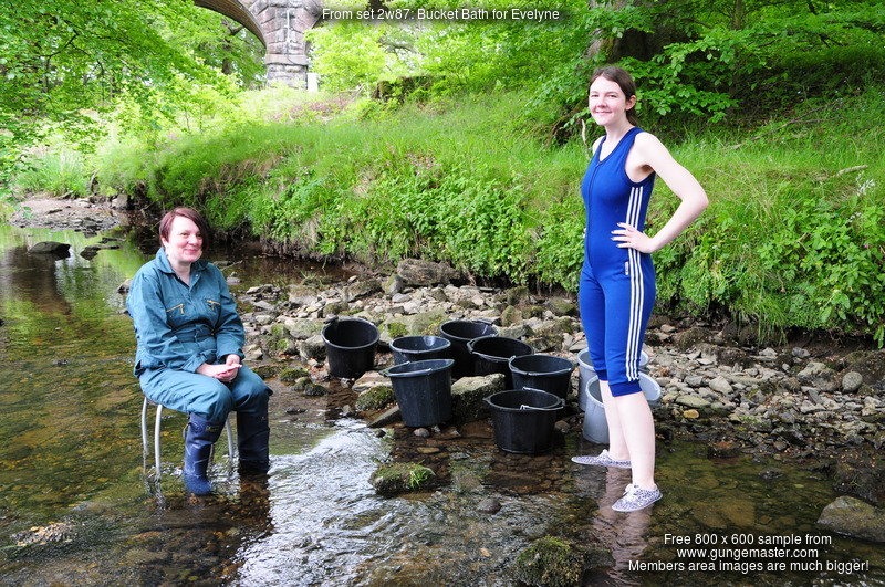 Evelyne the cook dons her green boilersuit and blue wellies, takes a seat on a stool in the river, and then has loads of buckets of water thrown over her by Chastity the Head Gardener, who's dressed in a tight fitting, figure-hugging sporty all-in-one herself.