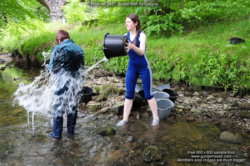 Note: The still photos show Chastity posing in her dress, dry, then soaking wet, and then going into, playing about in, and coming out of, the river. The video shows the actual bucketings in full detail, followed by the river paddle.