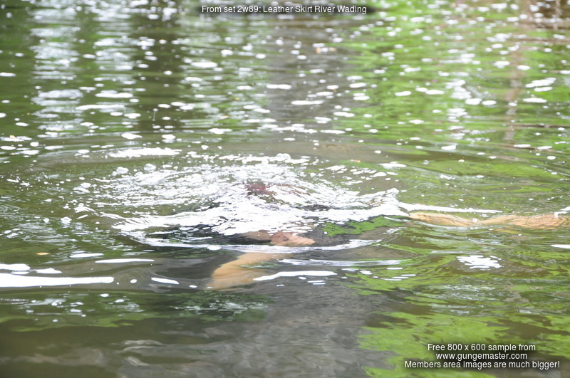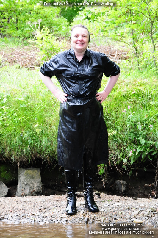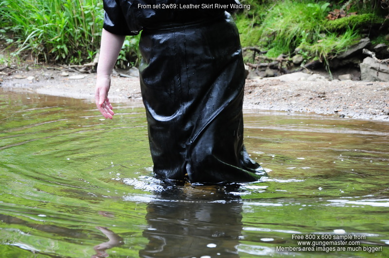 Note the skirt Evelyne is wearing is real leather, not pleather or vinyl, as are her boots. She is wearing black tights under the skirt but we hardly get to see them, though of course they get totally drenched under the skirt. Evelyne realy enjoys splashing about in rivers and the sea, and chose this outfit herself to get soaked in.