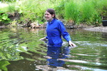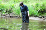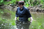 Chastity, dressed casually in black swimsuit, blue urban combats, and union jack wellies, wades chest deep in the estate river, soaking her outfit completely and going into and out of the water several times, showing off her soaked clothes. Once she's totally drenched, she plays in the water, bobbing in the deep area and then sitting in the shallows, legs and bottom in the water.