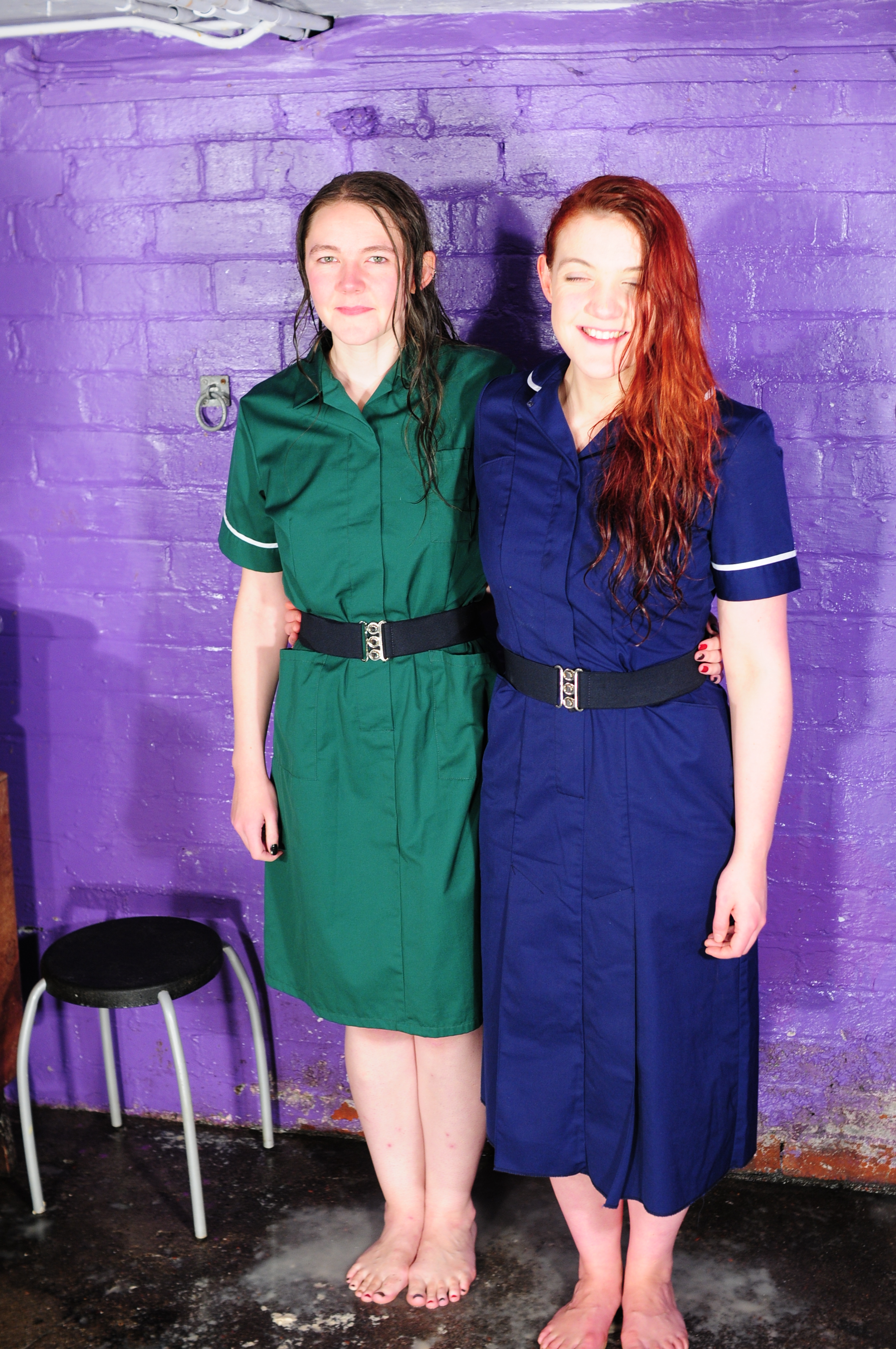 Take three beautiful young women, neatly dressed in smart nurses uniform dresses, one in navy blue, one in lilac, and one in bottle green, add multiple buckets of water, and guess what happens?
