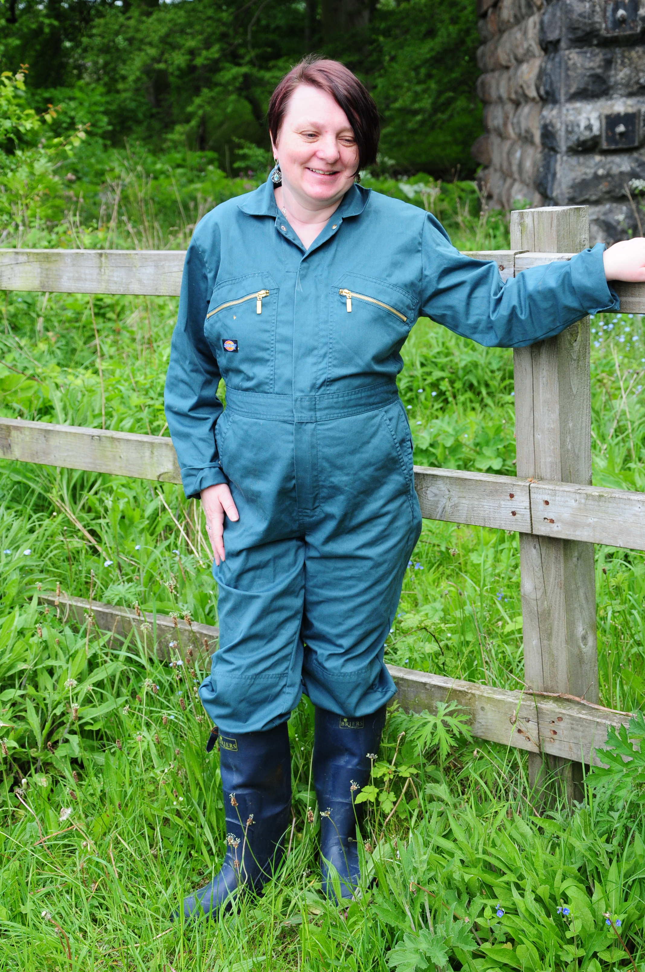 Here we see her giving one of her working outfits a complete drenching, wading into the cold waters of the estate river in a royal blue boilersuit and union jack wellies.