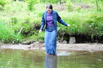 She finishes off sitting in the shallows, partly submerged, lying back and enjoying her wet clothes. The river was cold the day she did this, but Chastity really loves the water!