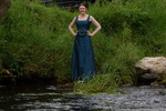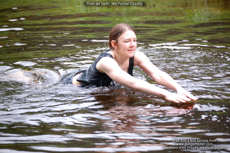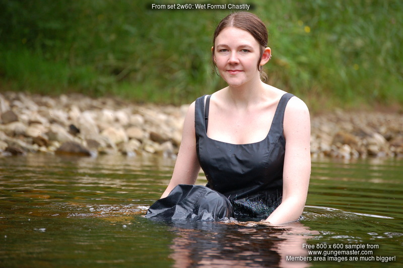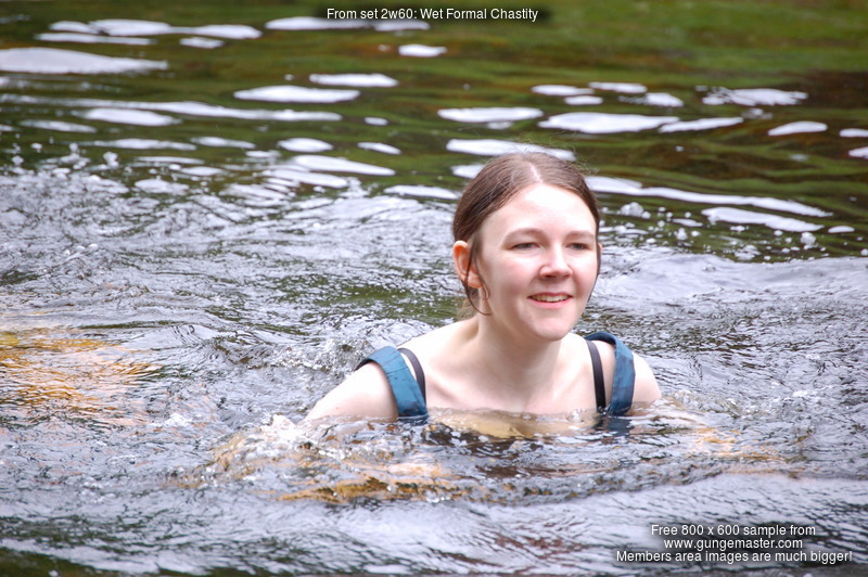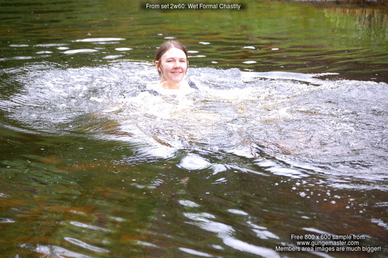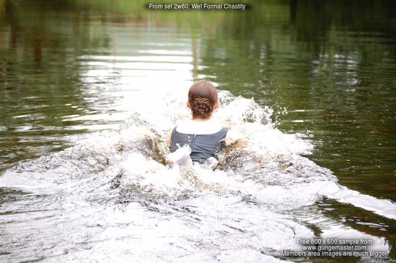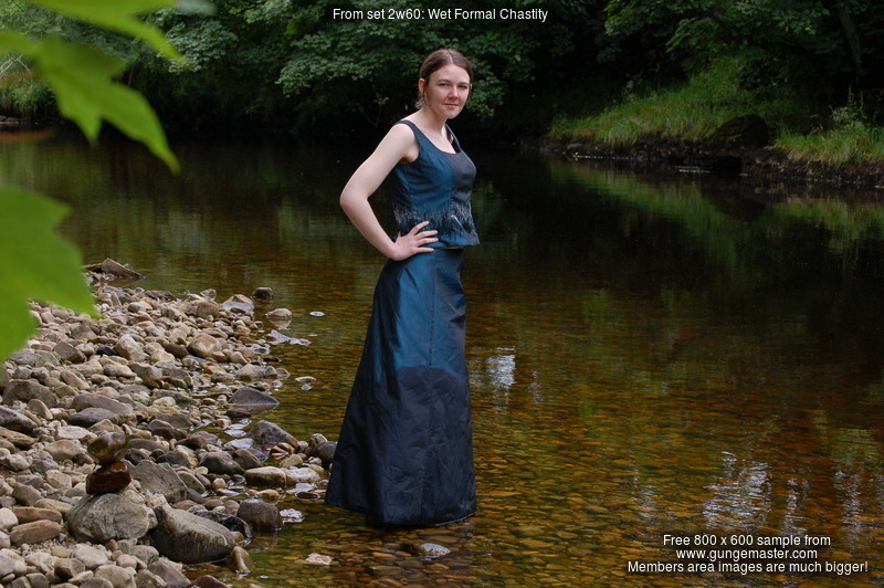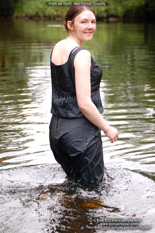 Chastity takes a smart skirt uniform into the river. She wears a navy blue knee-length uniform skirt, a full-sleeve pale blue uniform blouse, and shiny black boots, and starts off posing in her pristine outfit, before sliding down the river bank on her bottom, getting faint mud stains on the back of her skirt in the process. Then she wades into the river, and we watch as the waterline steadily rises up her skirt as she steps deeper. Once she's waist deep, she ducks, paddles, and floats with her boots on the surface, her clothes totally drenched in the water. To finish, she poses, soaking wet, on the bank again.