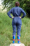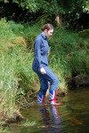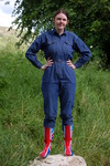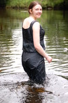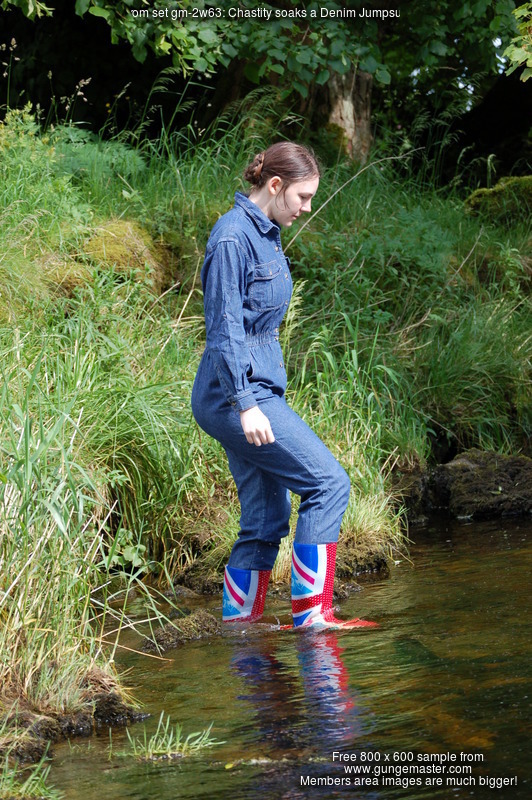 Chastity goes for a paddle and wallow in the river wearing a vintage 1970s blue denim jumpsuit and union jack wellington boots. She gets completely soaked from head to toe and spends a good long while playing in the river soaking wet.